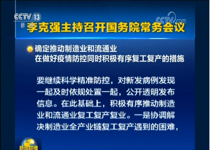 李克強(qiáng)主持召開國務(wù)院常務(wù)會(huì)議 積極有序推動(dòng)制造業(yè)和流通業(yè)復(fù)工復(fù)產(chǎn)復(fù)業(yè)