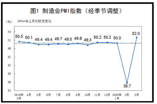 統(tǒng)計(jì)局:3月份中國制造業(yè)PMI為52.0%,較上月回升16.3個(gè)百分點(diǎn)