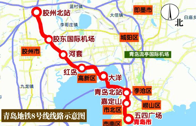 青島地鐵8號(hào)線工程起點(diǎn)自膠州北站,終點(diǎn)至五四廣場(chǎng),全長(zhǎng)61.4公里,設(shè)車站18座,其中高架站1座,地下站17座,連接了膠州北站、膠東國(guó)際機(jī)場(chǎng)、紅島火車站、青島北站、五四廣場(chǎng)站等五大交通樞紐,是連接青島新機(jī)場(chǎng)、北岸城區(qū)、東岸城區(qū)的快速骨干線路。