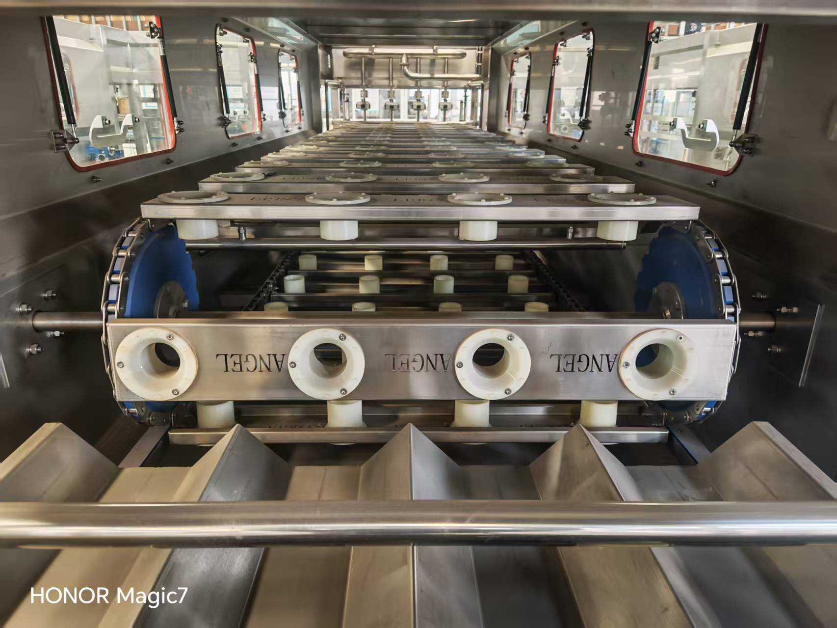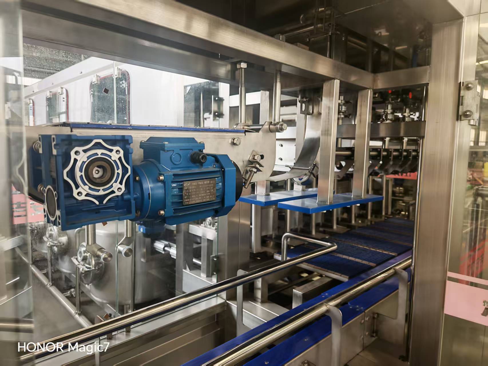 該設(shè)備集自動(dòng)拔蓋、自動(dòng)外刷桶、自動(dòng)上瓶機(jī)構(gòu)、自動(dòng)洗瓶消毒、自動(dòng)灌裝、自動(dòng)套蓋、自動(dòng)壓蓋和燈檢、熱縮膜、提桶套袋、成品送出為一體,使用的原材料符合食品行業(yè)和其他行業(yè)要求。該設(shè)備采用AC380V電源.