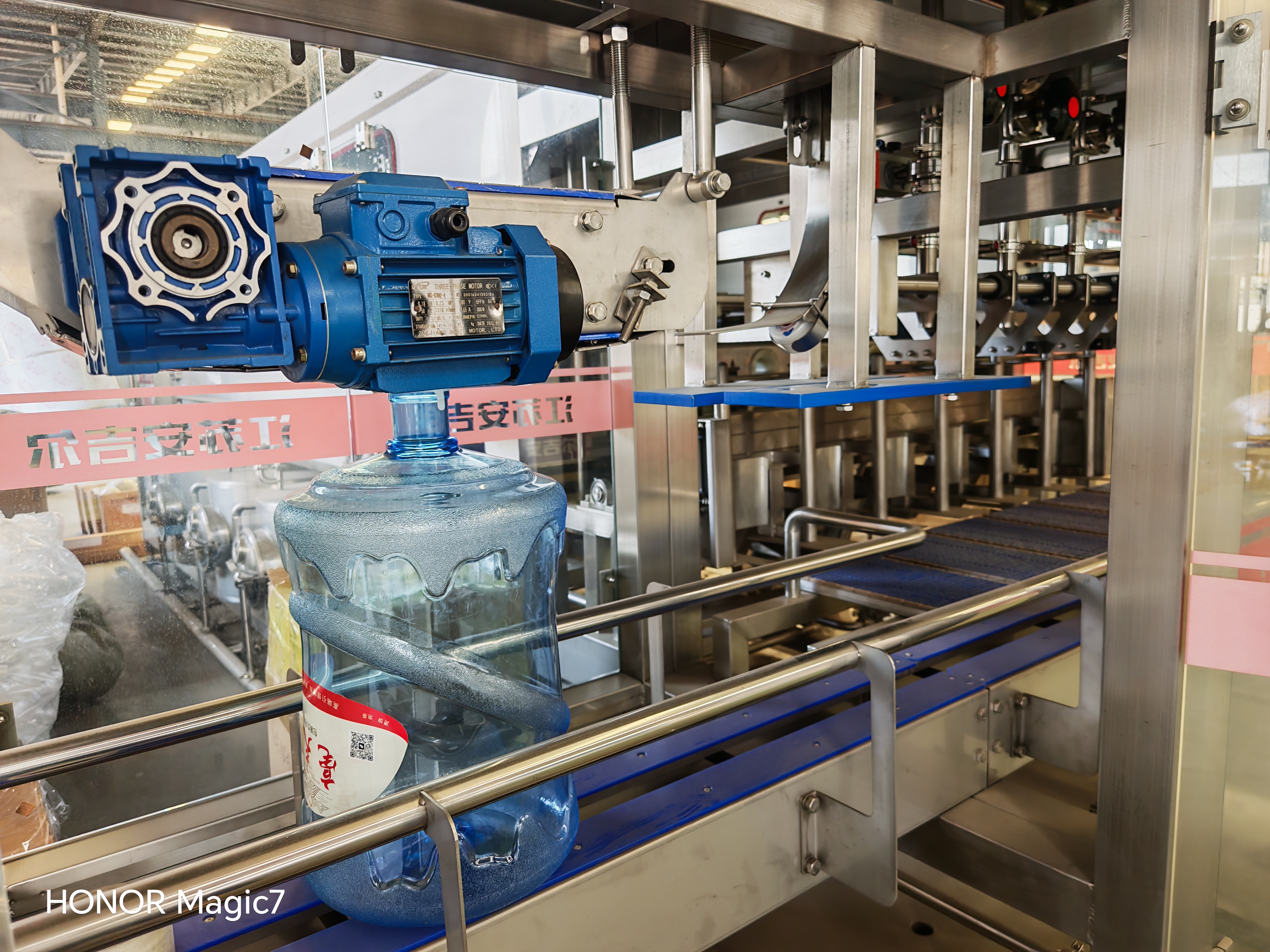 工作步驟:自動拔蓋-自動外刷桶-自動上桶-藥洗-原水內外洗-純水內洗-灌裝-自動理蓋-壓蓋-自動傳送帶傳出-燈檢-熱縮-成品